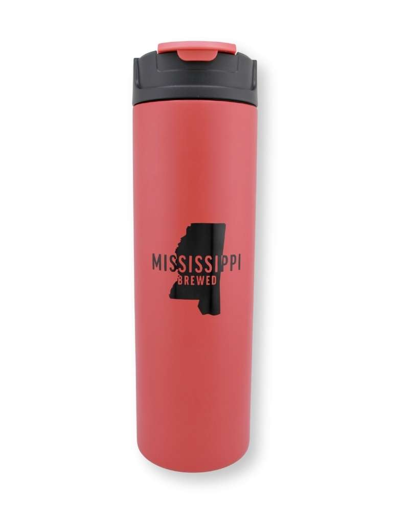 Celebrate Mississippi's rich coffee culture with the Mississippi Brewed Red Insulated Tumbler from Cups Espresso Cafe. This eye-catching 20oz stainless-steel tumbler features a bold "Mississippi Brewed" design with the state silhouette on one side and the classic Cups Espresso Cafe logo on the reverse, a tribute to our roots in the Magnolia State.